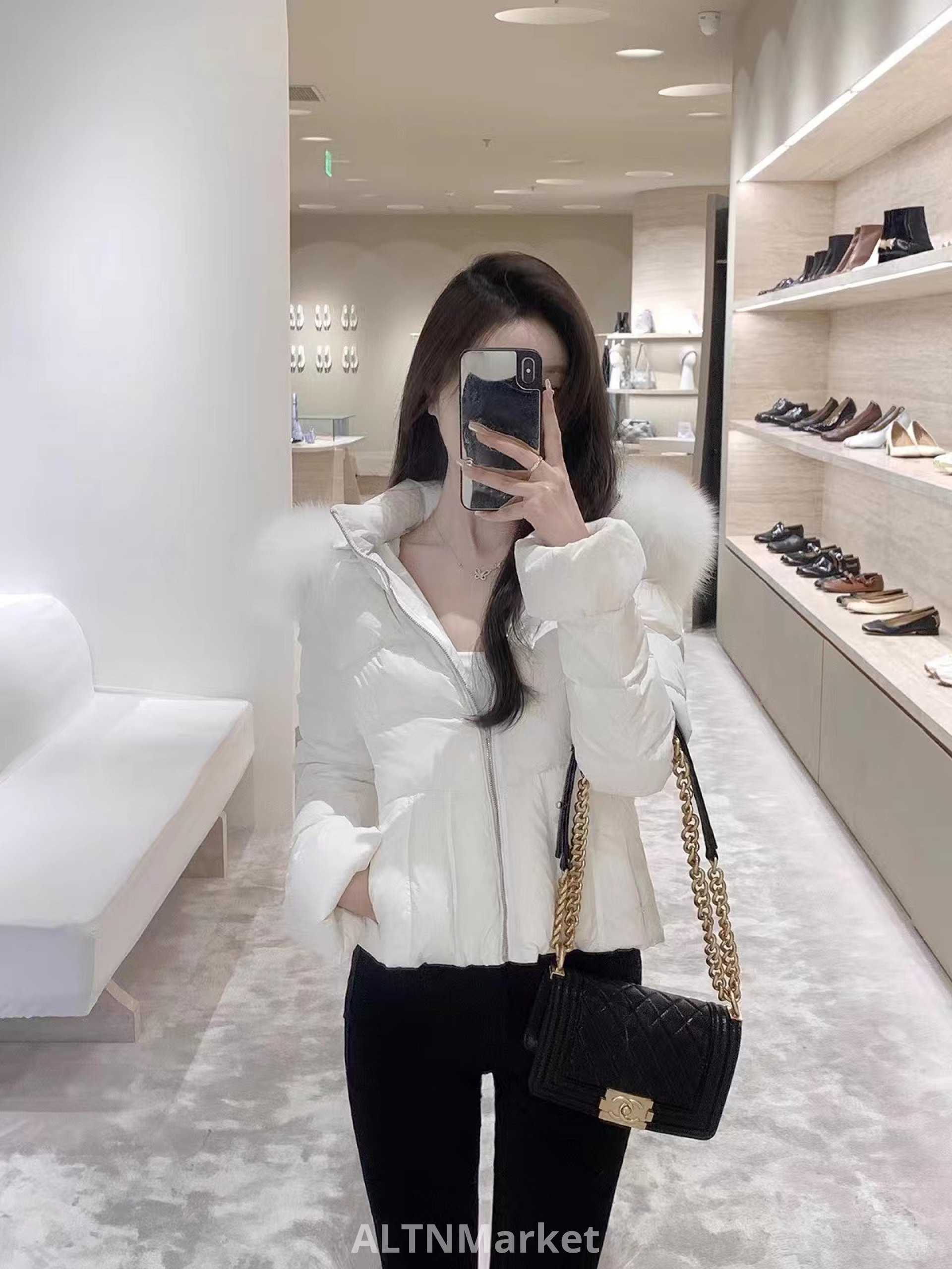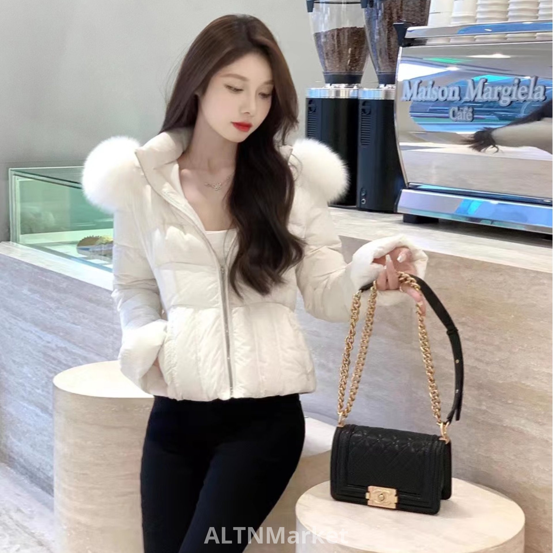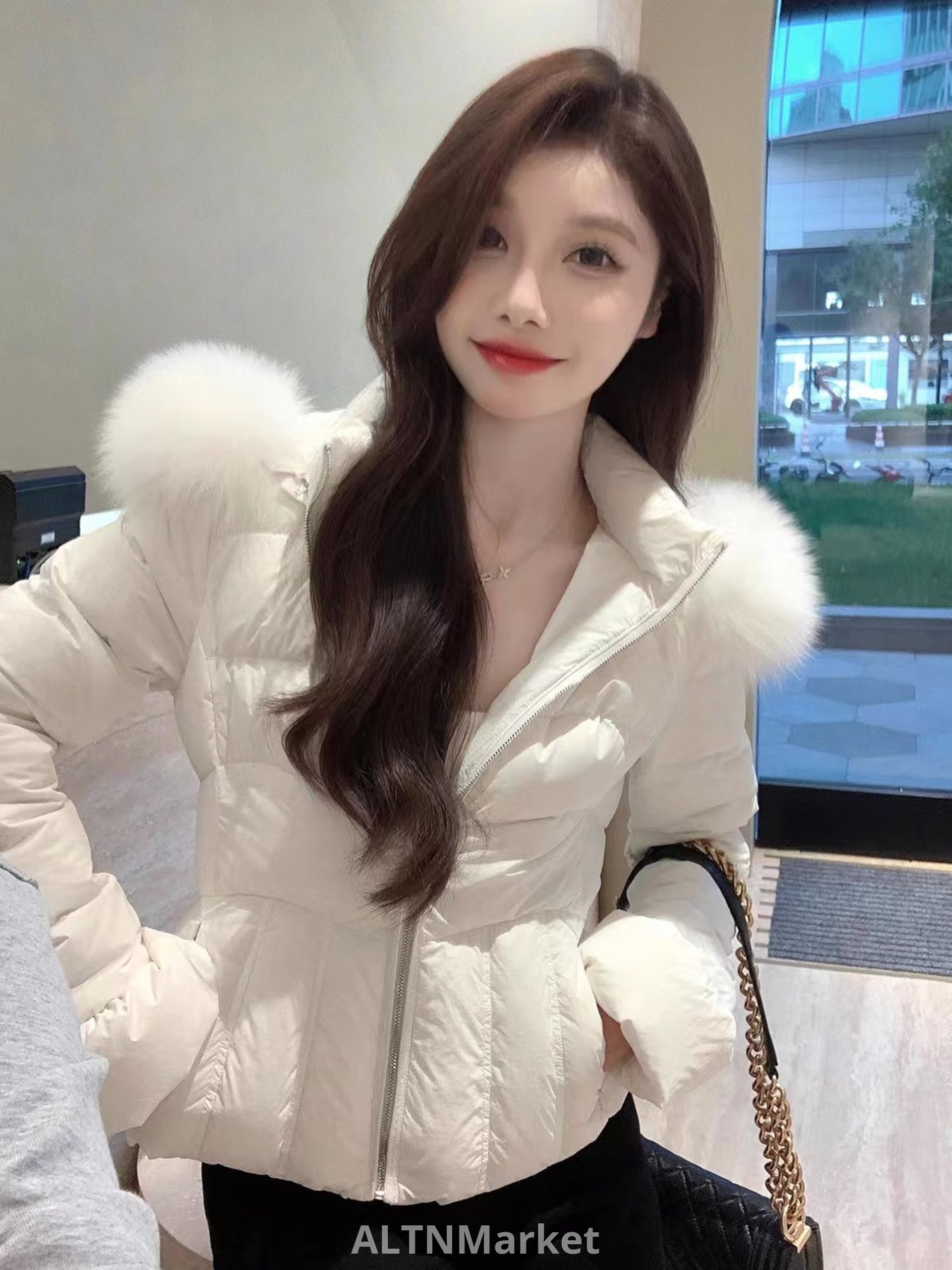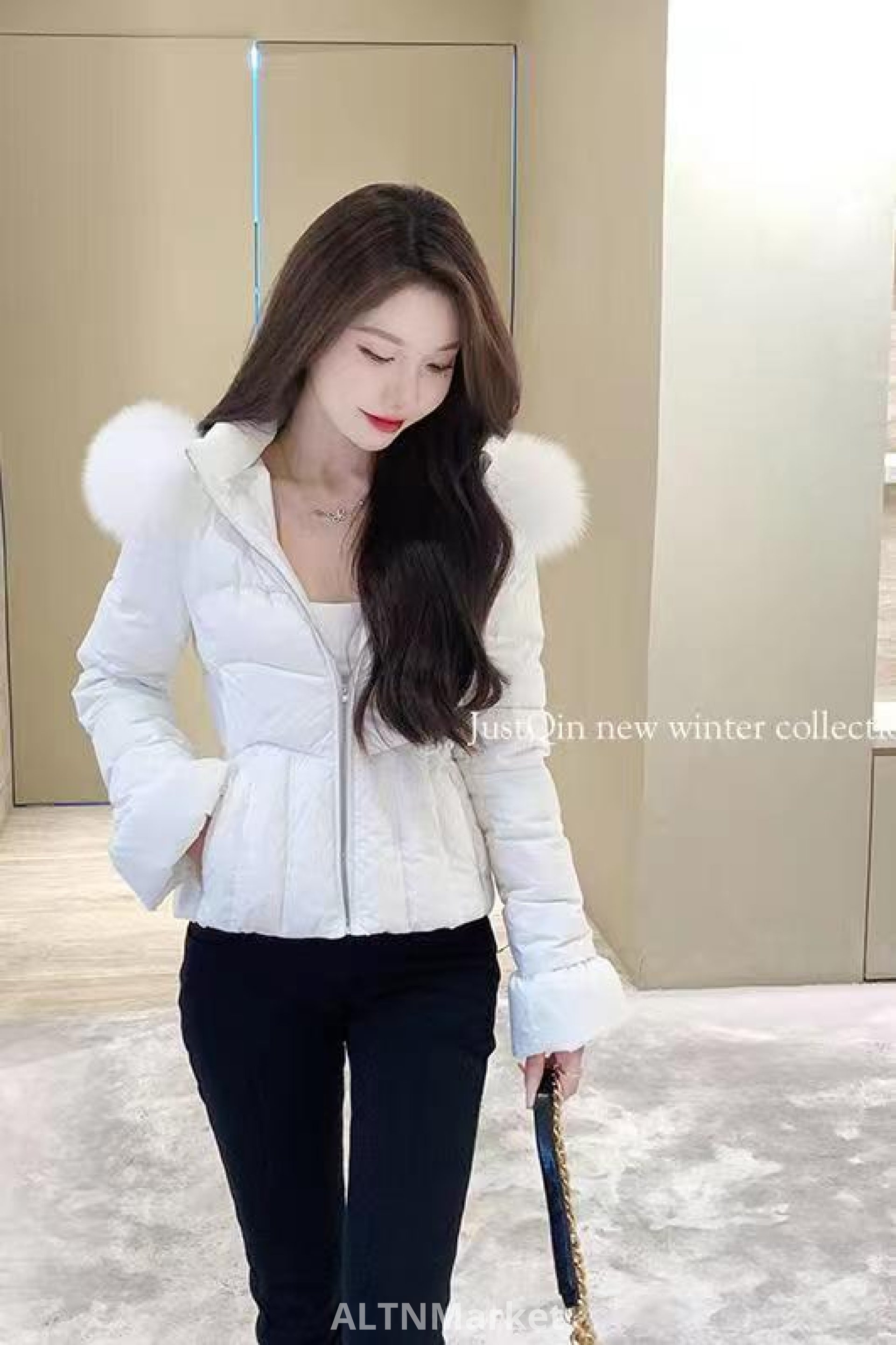 justqinlulu талии осень и зима новый стиль 2025 корейский стиль большой меховой воротник талии зажимать вниз Padded женщин пальто