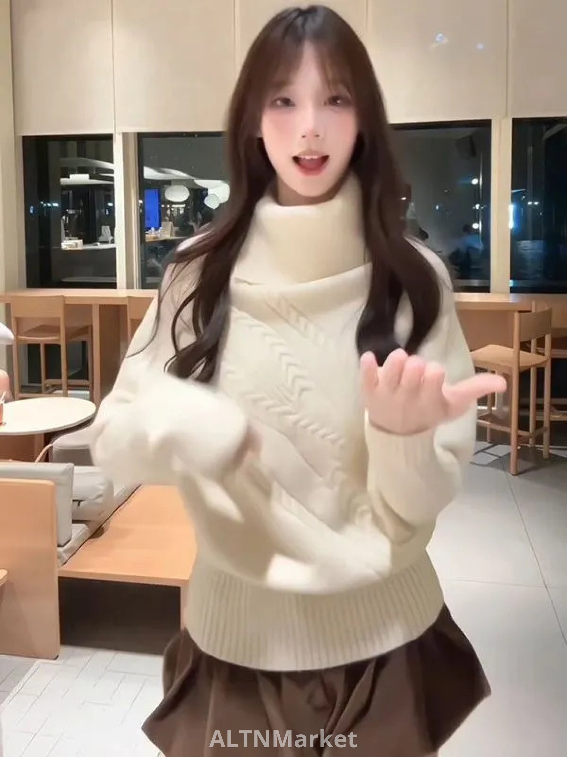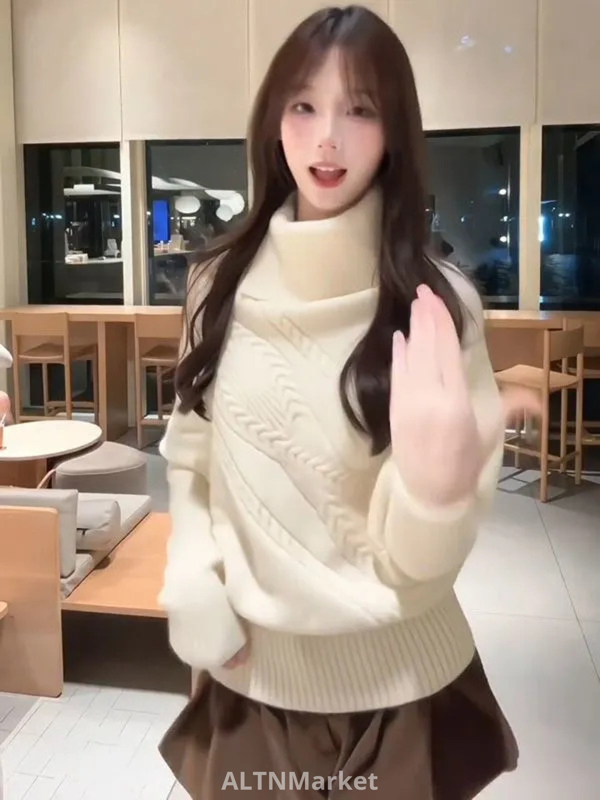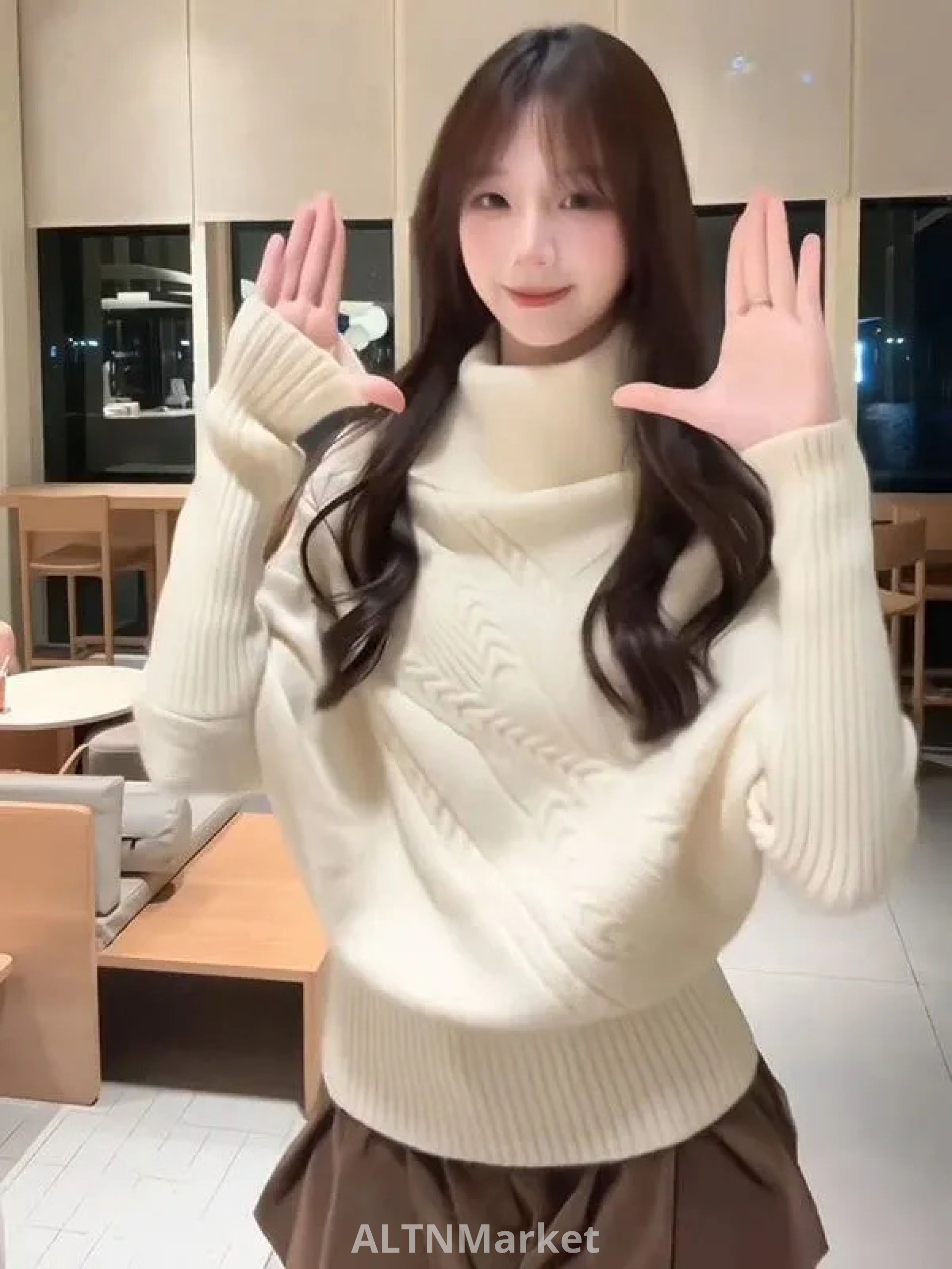 Gentle Turtleneck Off-white Twist Flower Loose Fit Cloak Sweater Women's Autumn and Winter Sweet Style Superior Batwing Sleeve Knit Top