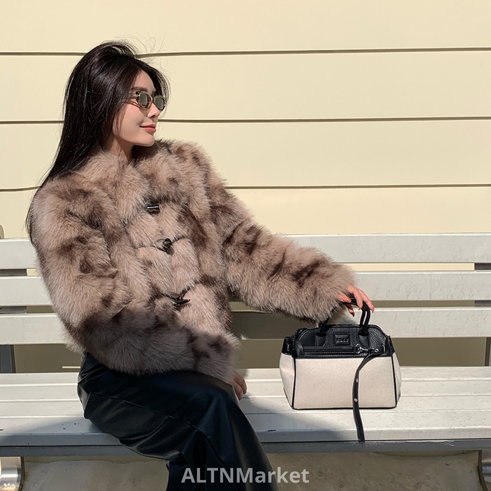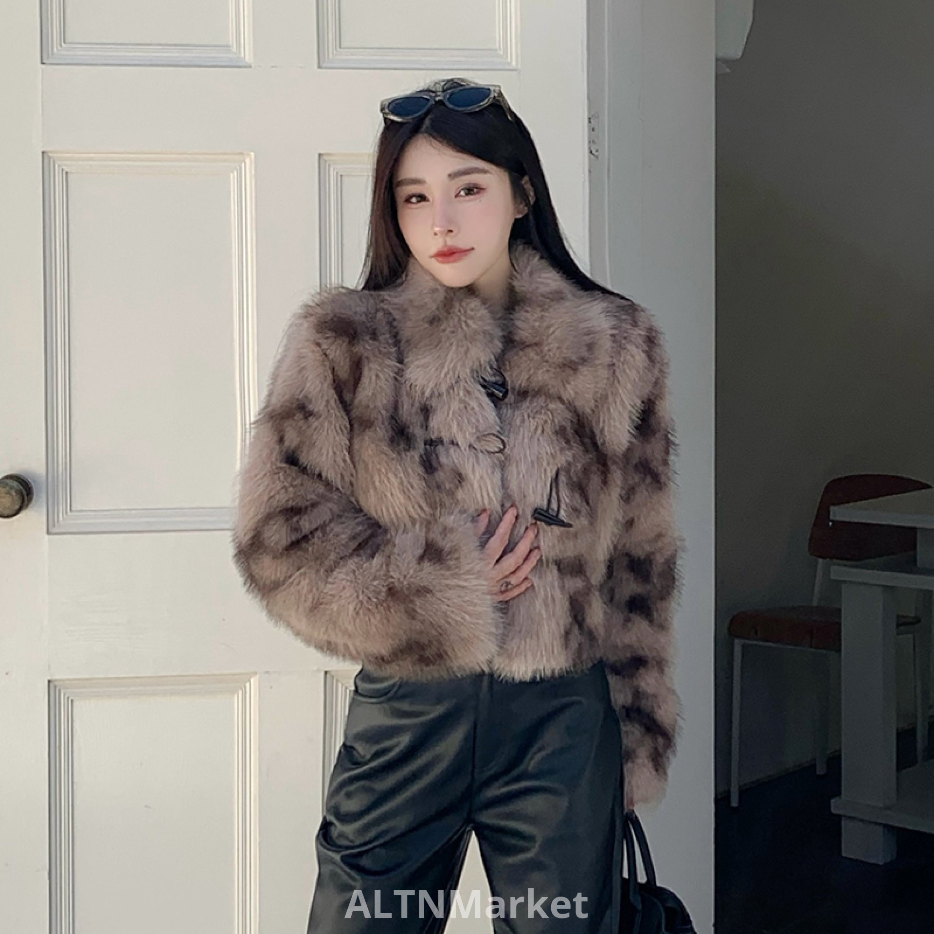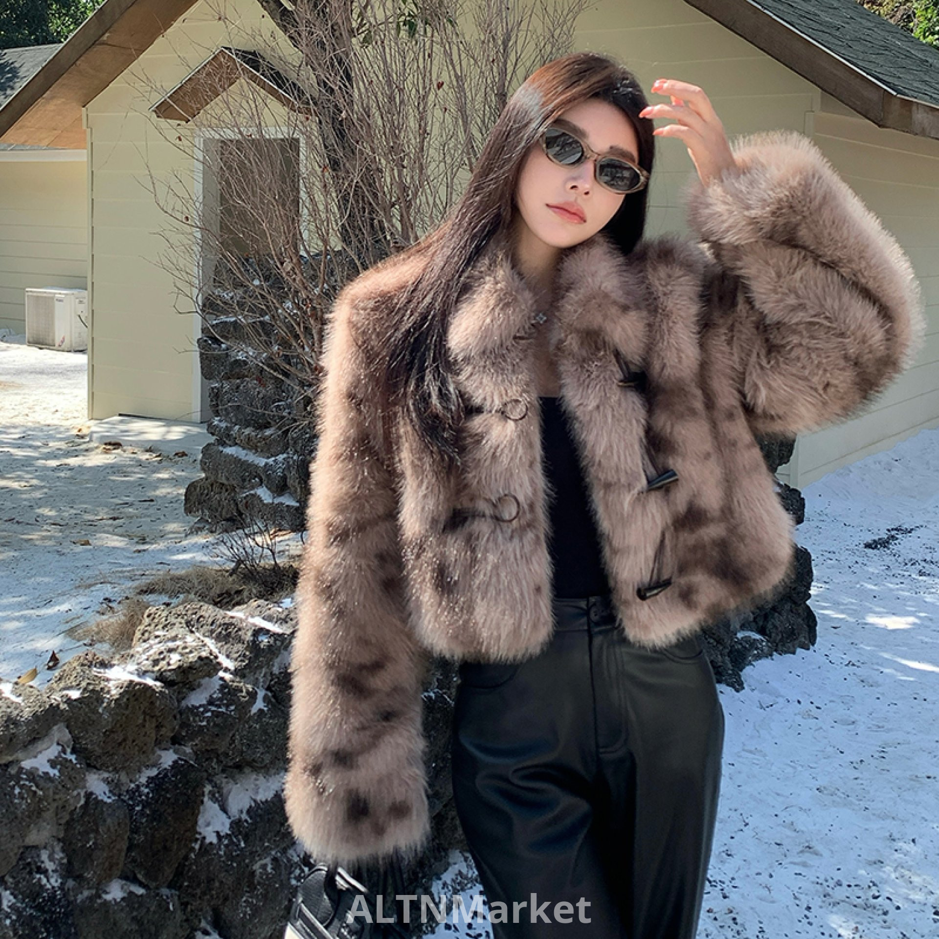 real photo Vintage Horn Buckle Short Style Leopard Print Imitation Fox Fur Fur Short Style Coat Winter Young A Furry Coat