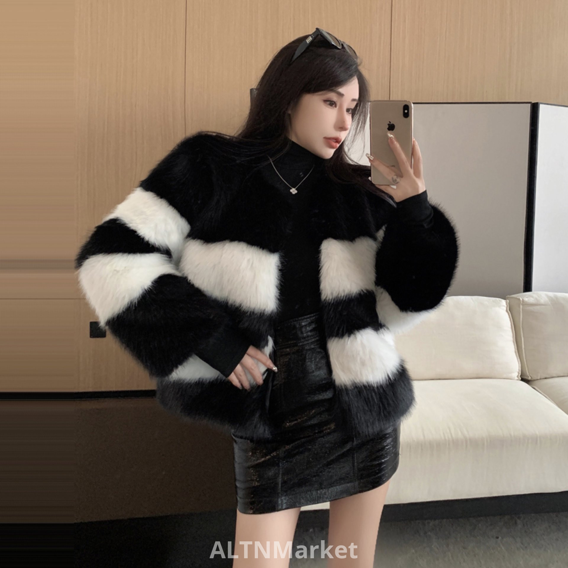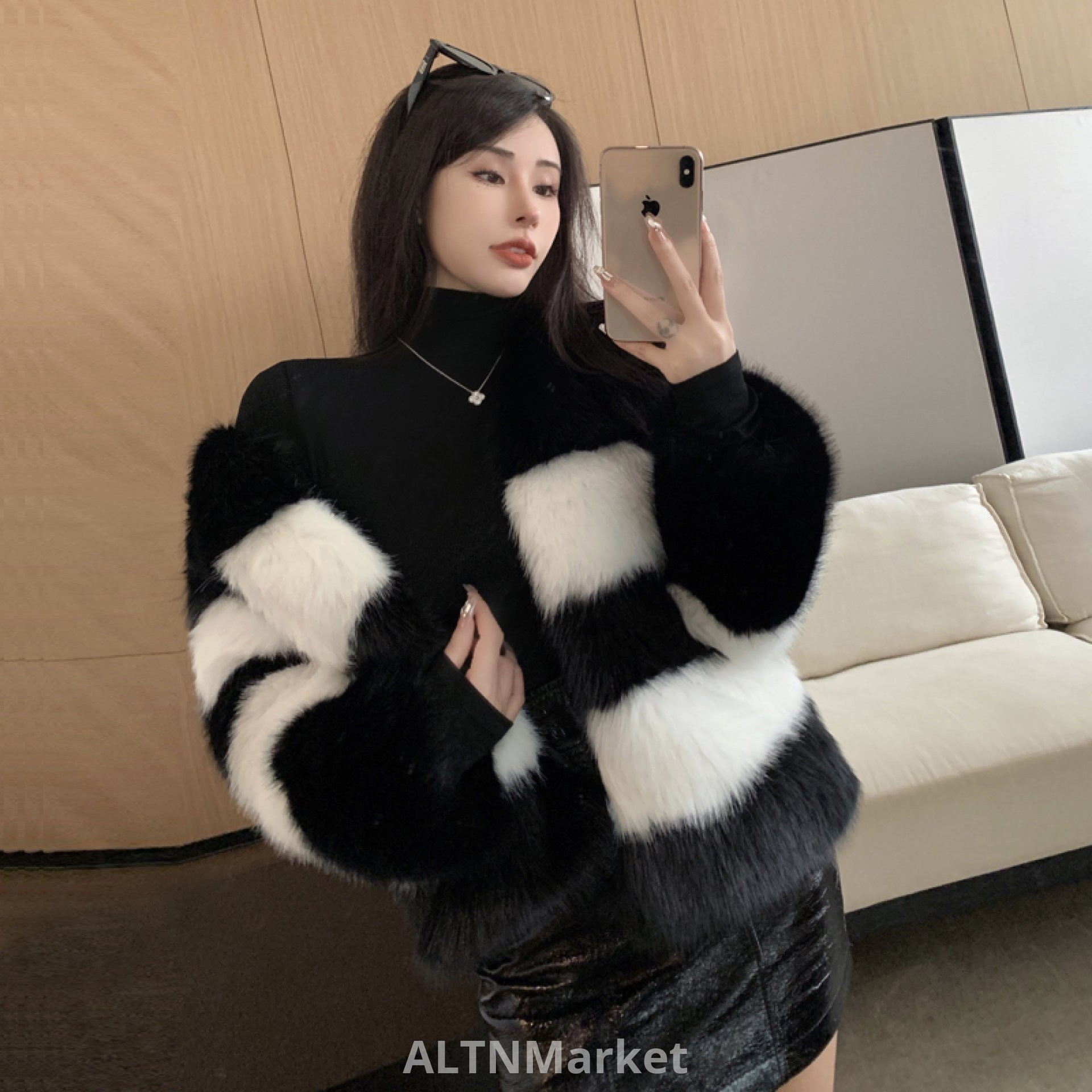 real photo Winter New Style Environmentally Friendly Fox Fur Fur Black and white Color Block Coat Female Short Round Neck Korean Style Furry Coat