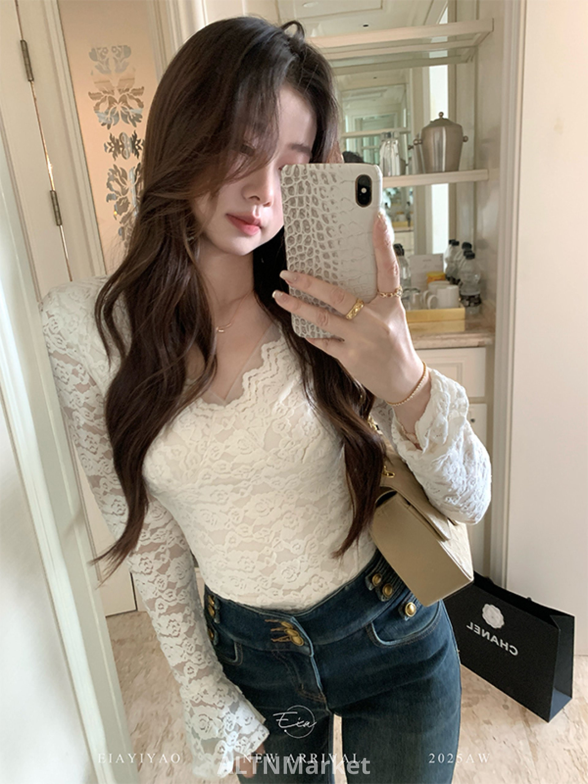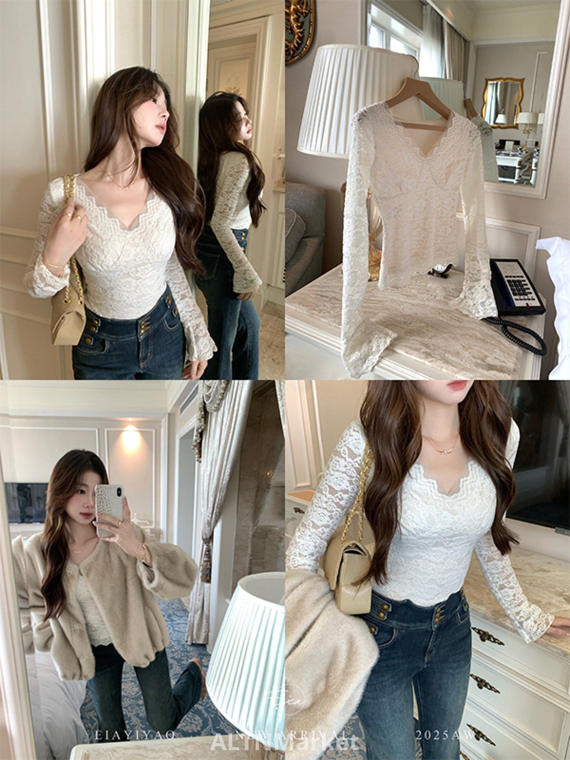 V Шея Шлифовка Волосы Длинный Рукав Топ Женщины Осень и Зима Кружева Сплайсинг Верхняя Одежда Внутри Возьмите Базовая Рубашка