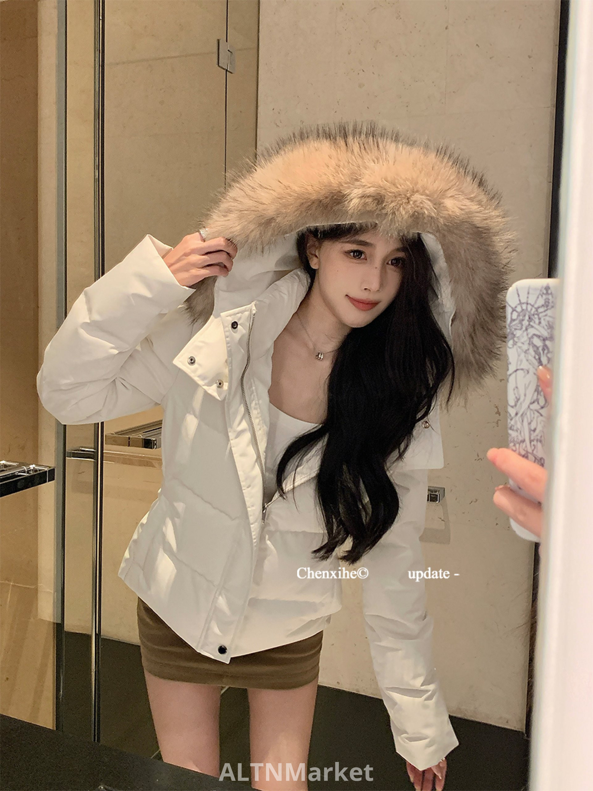 Цвет: Белый с воротником из экологически чистого меха, черный с воротником из экологически чистого меха, темно-синий с воротником из экологически чистого меха, белый с воротником из натурального меха енота, черный с воротником из натурального меха енота, темно-синий с воротником из натурального меха енота